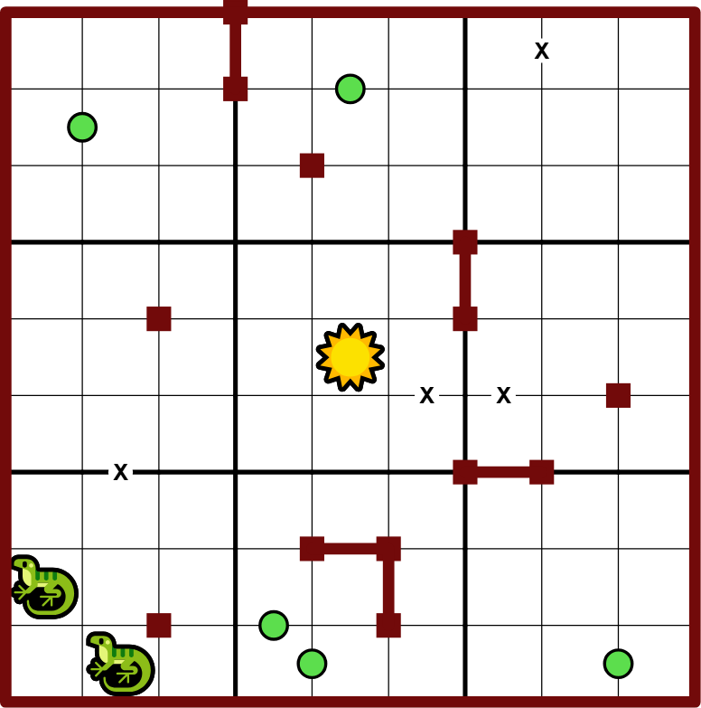 • Jede Eidechse nimmt einen Weg aus Schritten, die jeweils von der Zelle aus starten, in dem sie angezeigt wird. Jeder Schritt nach dem ersten beginnt auf der Zelle, auf dem der vorherige Schritt endete.