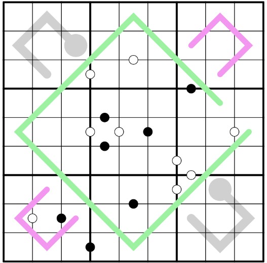 Die Zahlen in den Feldern, die mit einem schwarzen Punkt verbunden sind, haben ein Verhältnis von 1:2. Die Zahlen in den Feldern, die mit einem weißen Punkt verbunden sind, sind aufeinanderfolgend. Nicht alle möglichen Punkte sind gegeben.
