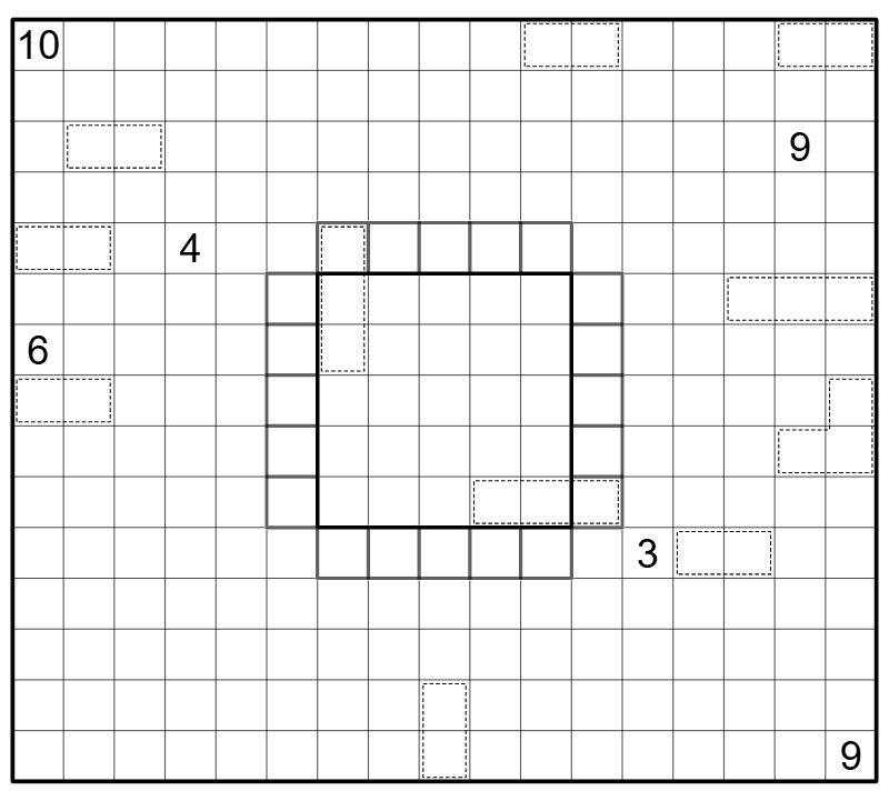 • Orthogonally adjacent cells outside the grid contain a number equal to the rank of the indicated 5-digit number according to its position, where 1 goes to the smallest and 20 to the largest.