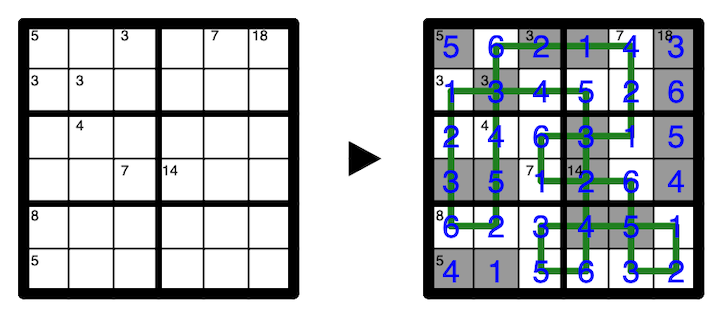 If a clued cell is unshaded, the clue indicates the sum of all numbers on the contiguous unshaded segment of the loop that passes through the clued cell.