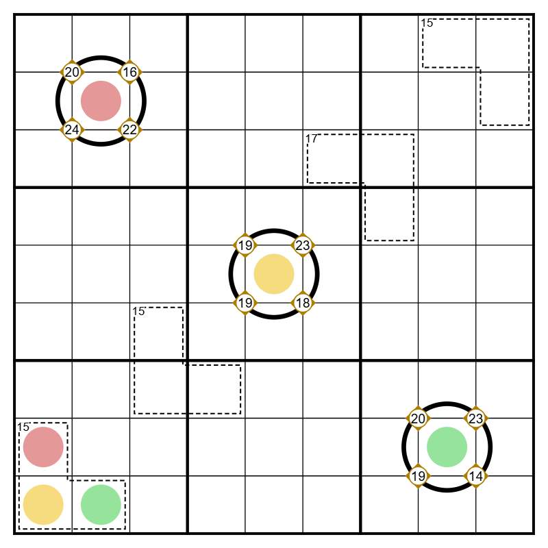 • Digits in cells touching a gold Sum Dot must sum to the indicated total.