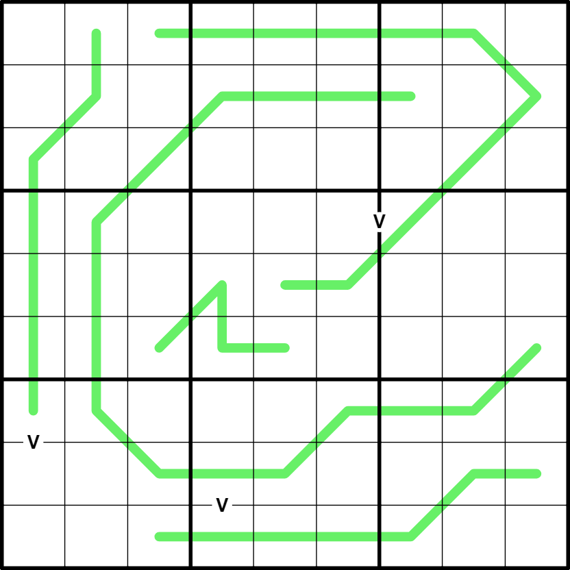 - V: Cells separated by a V must sum to 5