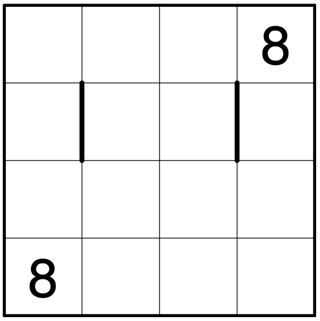 Geschlossene Grenzen: Jede dicke Kante stellt eine „geschlossene Grenze“ dar. Die einfache Schleife kann nicht durch eine „geschlossene Grenze“ verlaufen, und ein einzelner Fillomino-Bereich kann nicht beide an eine „geschlossene Grenze“ angrenzenden Zellen belegen.