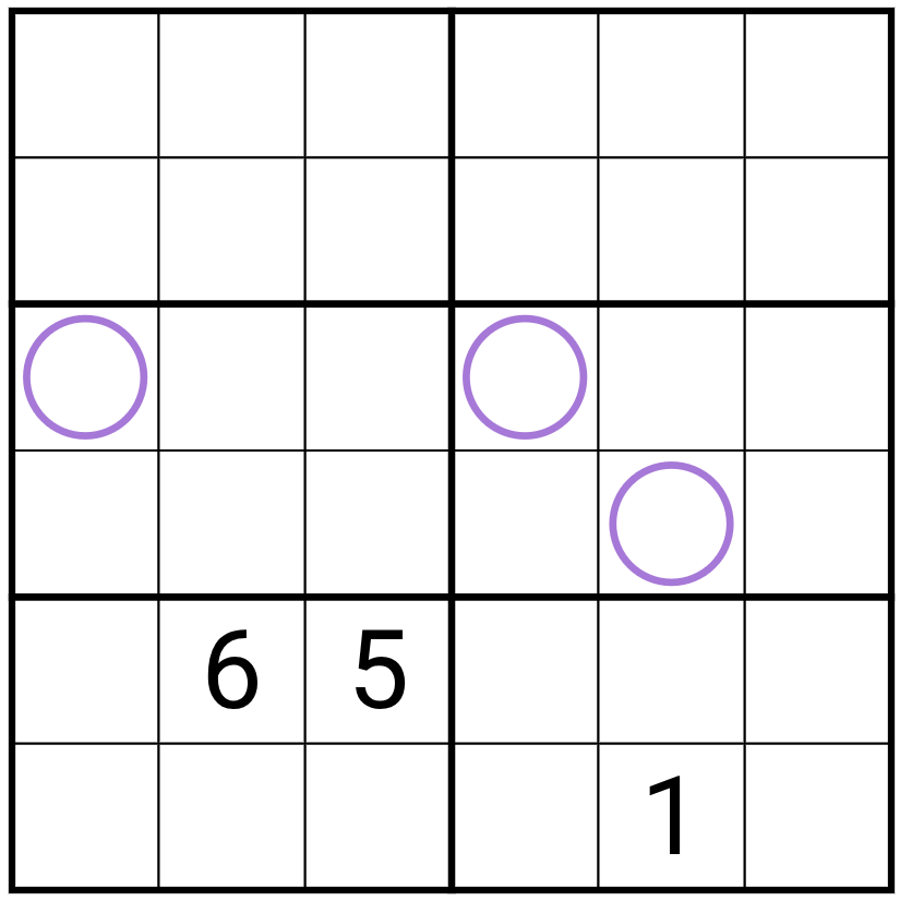 Modified Nurikabe: Draw 3 lines of length 2 or more such that each circle is the center of one of these lines. The lines only move orthogonally and may not touch themselves or each other orthogonally. Each 2x2 must contain at least one cell on a line. Non-line cells form a single orthogonally connected area.