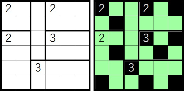 • Heyawake: Shade some cells so that no two shaded cells are orthogonally adjacent and the remaining unshaded cells form one orthogonally connected area. There cannot be a horizontal or vertical line of unshaded cells that goes through 2 or more region borders.