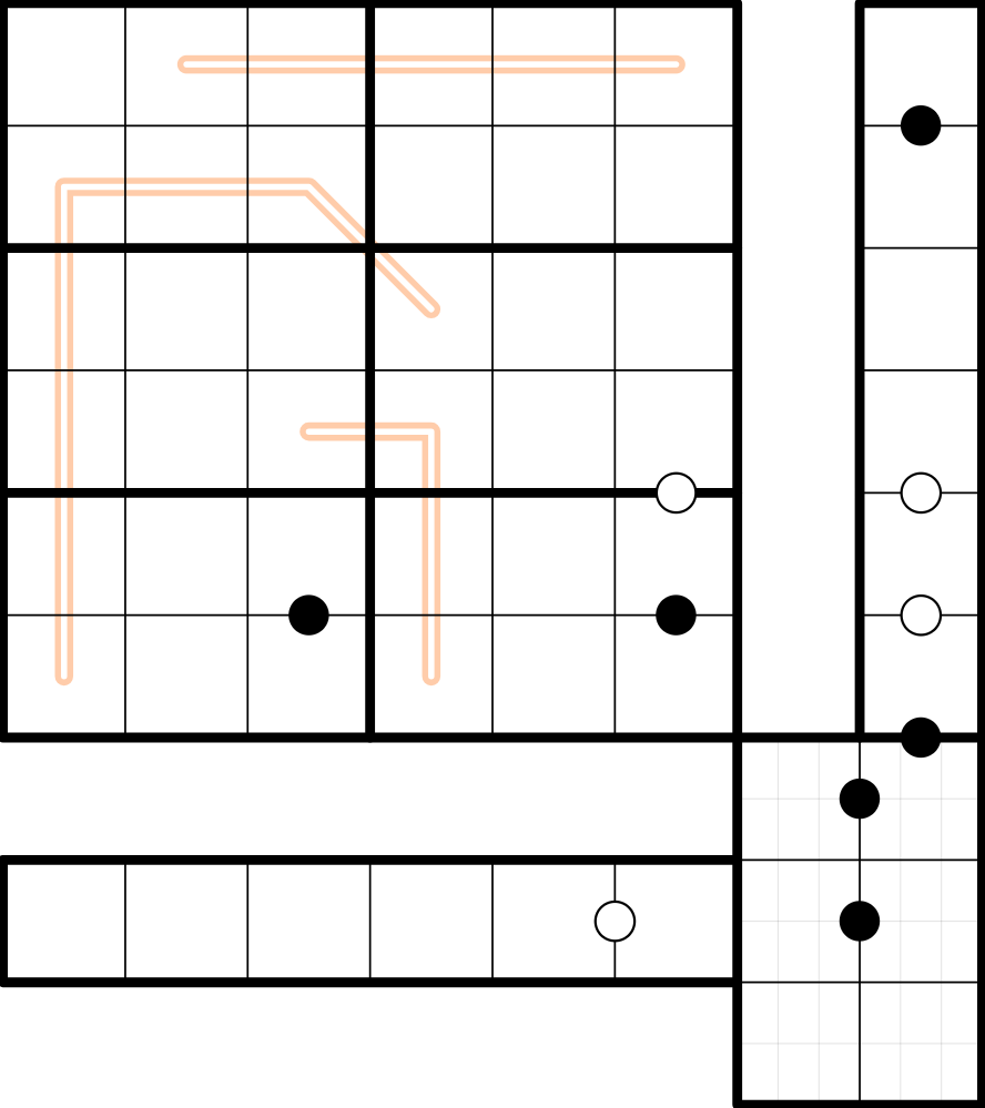 - Kropki Dots: Digits separated by a white dot are consecutive. Digits separated by a black dot have a 1:2 ratio. Not all dots are necessarily given.