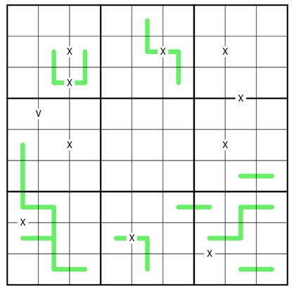German whispers: Adjacent digits on a green line must have a difference of at least 5. All German whisper lines have been given that would be vertical or horizontal. (i.e. There is a negative constraint, but this does not apply to diagonally adjacent digits.)