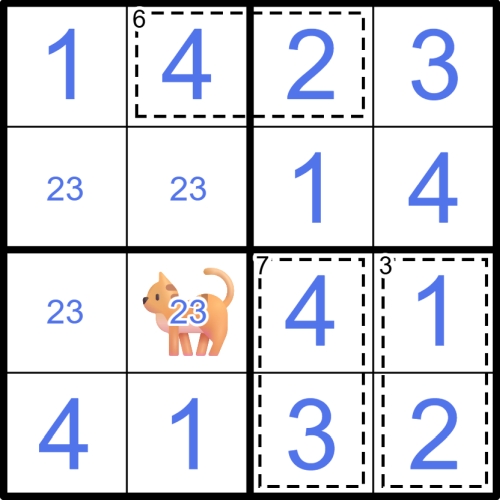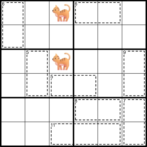 Took me a few tries to figure out the rules. I initially read it as "cells without a cage or cat contain anywhere from 0 to 6 numbers," and leaving the option for blank cells open made it... hard.