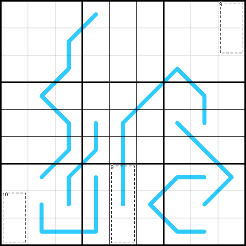 Region Sum Lines: Box borders divide blue lines into segments. For each line, all of its segments have the same sum.