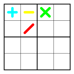 Arithmetic symbols: the digit in the square containing a symbol is the result of performing that operation on all of the adjacent squares pointed to by the symbol.