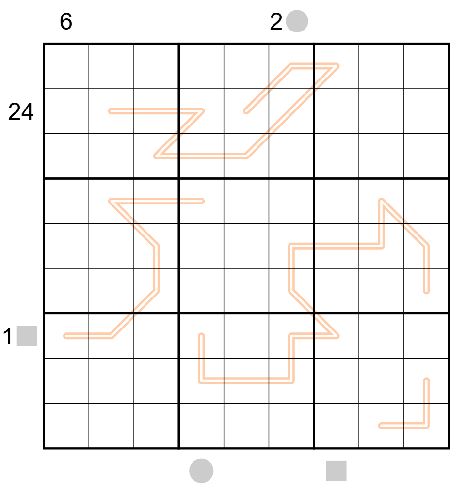 - Up to N-sums: A clue outside the Row or Column N indicates the sum of all digits up to the cell that contains the digit N. (The digit N itself is not included in the sum.)