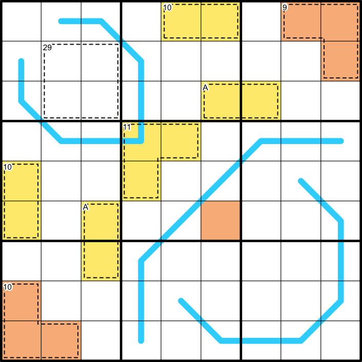 Killer: Digits in a cage do not repeat and sum to the indicated total. Cages marked with an “A” sum to the same total.