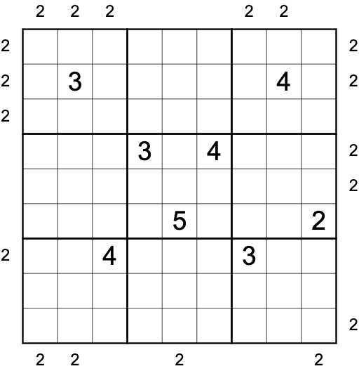 Skyscrapers: Each cell represents a ‘skyscraper’ whose height is the digit in that cell. Taller skyscrapers obscure the view of smaller ones. Clues outside the grid tell how many skyscrapers are visible looking across the row or column from the direction of the clue.