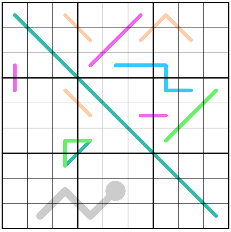 Modular Lines: Every 3 consecutive cells along a teal modular line must contain a complete set of residuals modulo 3. i.e: one from (3,6,9), one from (1,4,7) and one from (2,5,8).