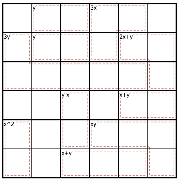 Killer: In cages, digits do not repeat and sum to the value of the expression in the upper-left corner. X and Y are integers. .