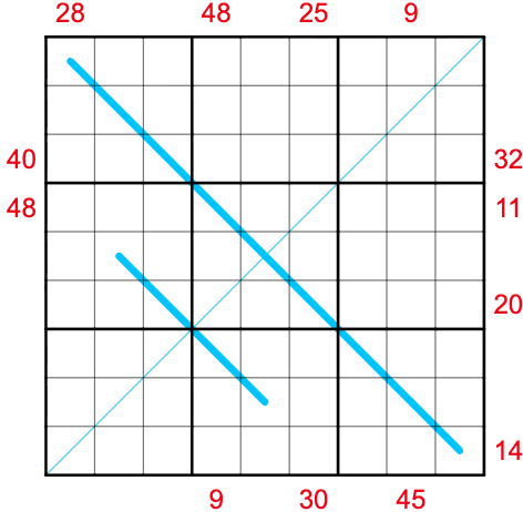 thick blue line, VALUES on the line have an equal sum N within each box it passes through.
