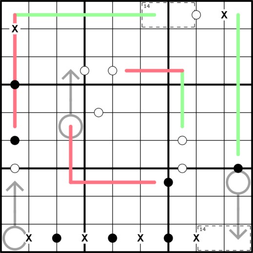 @JVA Thanks so much for commenting. Everyone has accepted that green is typically a German Whisper Line. Confusion arises with the RENBAN Line, where the puzzle is magenta, which I register as pink, but people typically referred to it as purple. So, in 2022, I began to make my RENBAN Lines (actually) purple. When I began to use Dutch Whispers in March 2023, Dutch Whispers was not even a selectable variant on LMD. In fact, it still isn't in 2026 (today). Since many of my puzzles involve intricate pictures, and German Whispers sometimes could not work for me, I became one of the primary users of the Dutch Whispers Line. I have been using a red color since 2023 for it. Only in the last 6 months has anyone even hinted that another color was more accepted than my red. However, if my picture REQUIRES a different color for any line than I might typically use, I let my artistic license guide me. For example: You may even see a German whispers line that isn't green occasionally. Peace to you. -Will Power