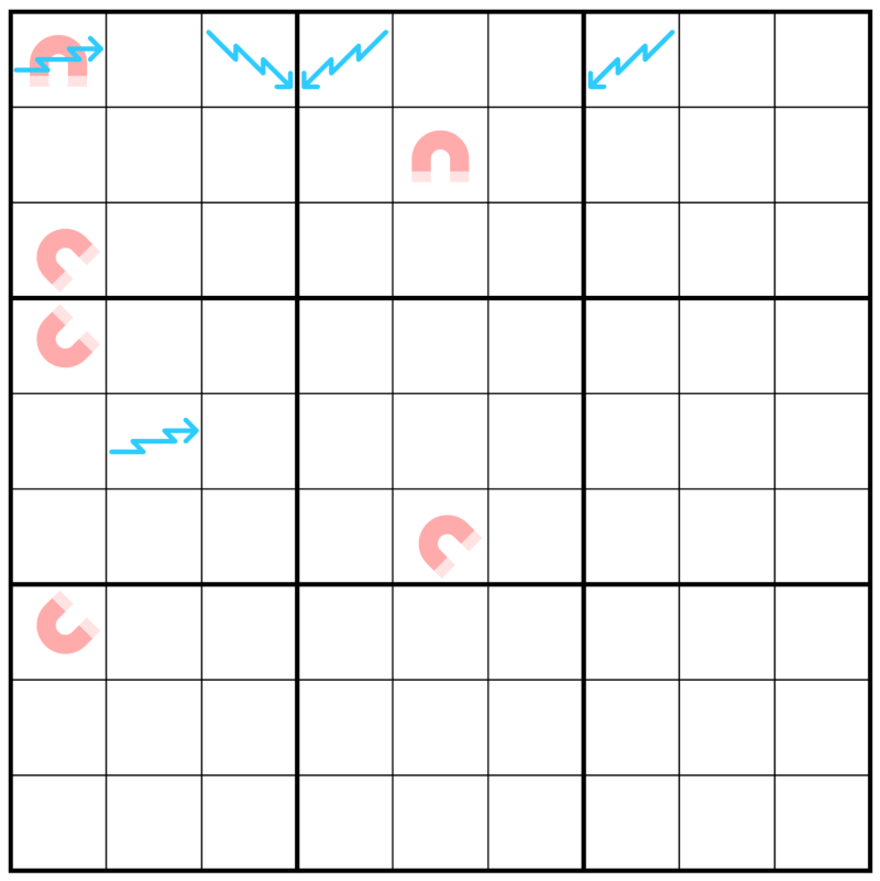 Electrics: The digit in an electric cell defines the length of a Region Sum line (defined below), which starts in the electric cell and travels straight in the indicated direction.