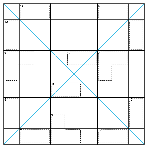 - Killer-Käfige: Ziffern in einem Käfig ergeben in der Summe den oben links angegebenen Wert.