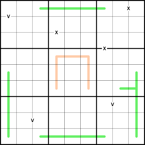 • Cells connected by an X must sum to 10. Cells connected by a V must sum to 5. Not all Xs and Vs are given.