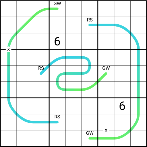 Melding: Each line in the grid can be divided into two segments, each with a different rule as indicated on the line's ends. Each segment spans at least two cells. The point at which the segments meet is a single cell, to be determined by the solver.