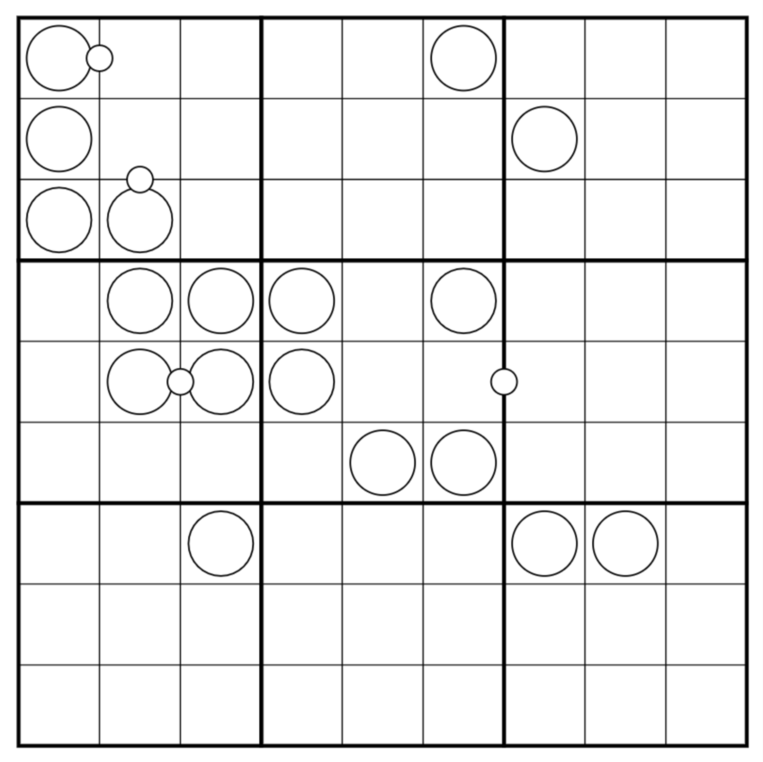 A digit in a circle indicates how many unique digits there are to be found in the up to 9 cells that form a 3x3 area around that circled digit.