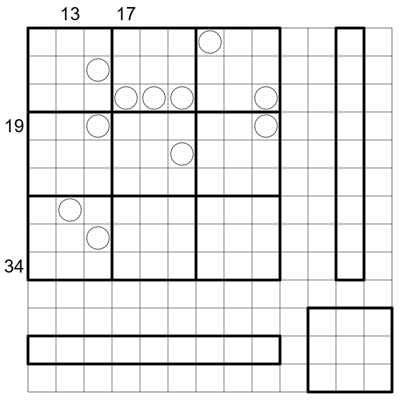 Cells with a circle show the number of cells they 'see' (including the cell itself) that have the same shading. Cells with a different shading block the view.