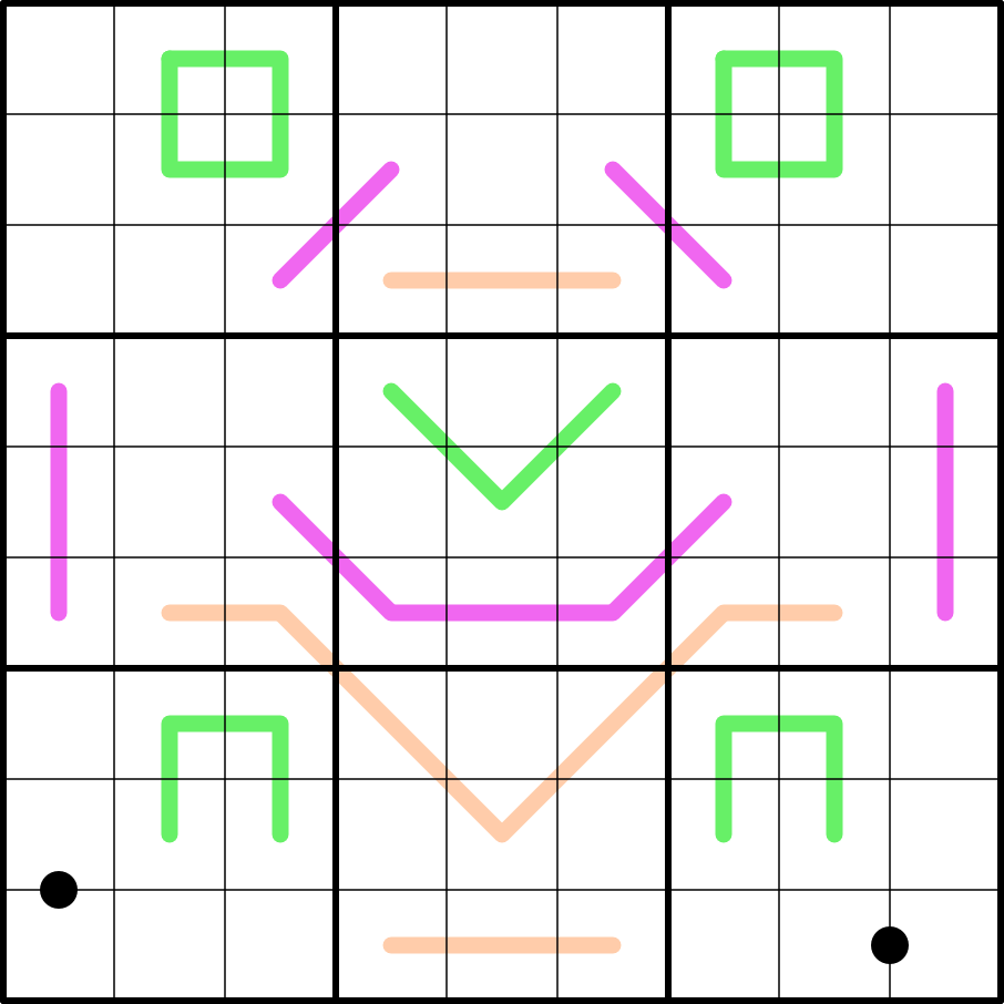 Every set of three adjacent digits along a peach "entropic line" contains one low digit (123), one middle digit (456), and one high digit (789).