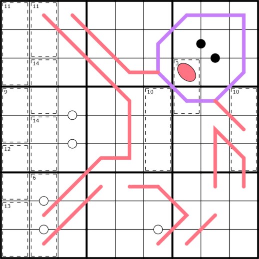 DUTCH WHISPERS- Numbers on red lines are at least 4 apart from their neighbors on the line. Numbers may repeat on red lines if other rules allow.