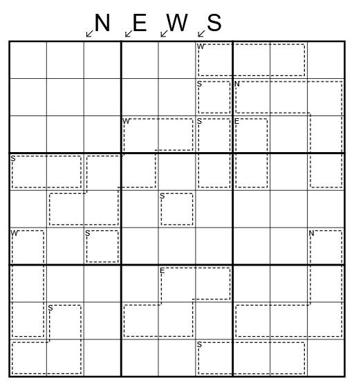 - Kryptische Hinweise: Jeder der Buchstaben N, E, W and S repräsentiert eine Zahl, die von dem/der Löser*in zu bestimmen ist. (Unterschiedliche Buchstaben dürfen die gleiche Zahl repräsentieren.)