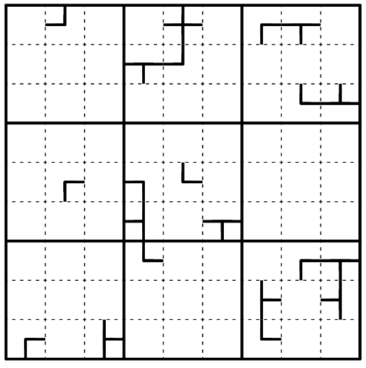 All cells must be connected through the dashes that appear in these elements. Dead ends are allowed (Aga rule).