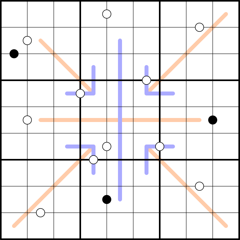 Colored lines are entropic lines. Every 3 consecutive cells along an entropic line must contain a low digit (1,2,3), middle digit (4,5,6) and high digit (7,8,9). Different colors show different lines.