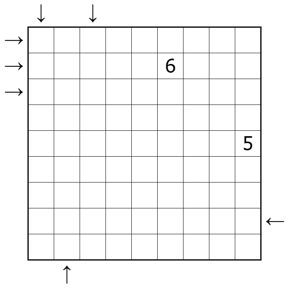 • Pfeile kennzeichnen außerdem X-Bereiche. Die erste Ziffer in der jeweiligen Zeile oder Spalte gibt die Gesamtzahl der Bereiche in dieser Richtung an. Bereiche verlaufen nicht erneut innerhalb der Sichtlinie des Pfeils.