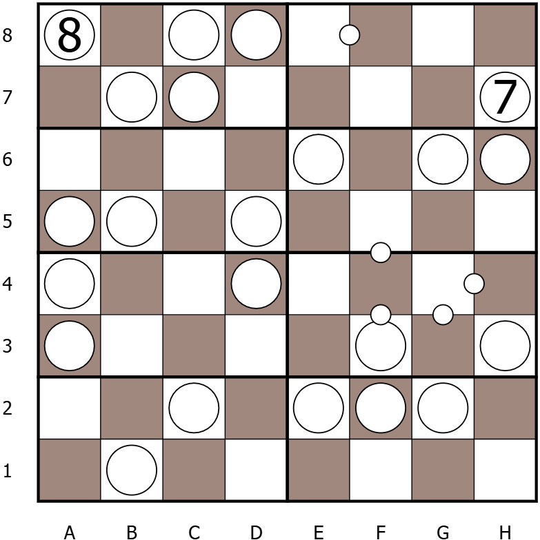 Es gelten die normalen 8×8-Sudoku-Regeln. Jede eingekreiste Zelle stellt eine Schachfigur auf dem entsprechenden Feld eines Schachbretts dar, wobei Weiß nach oben zieht. Jeder Figurentyp und jede Farbe ist einer eindeutigen Ziffer zugeordnet (zum Beispiel teilen sich alle weißen Bauern eine Ziffer und alle schwarzen Bauern eine andere), und nicht alle Figurentypen müssen vorkommen. Alle weißen Figuren sind global niedriger als alle schwarzen Figuren., und innerhalb jeder Farbe folgen die Ziffernwerte – sofern vorhanden – der üblichen Figurenhierarchie im Schach: Bauer < Springer < Läufer < Turm < Dame < König.