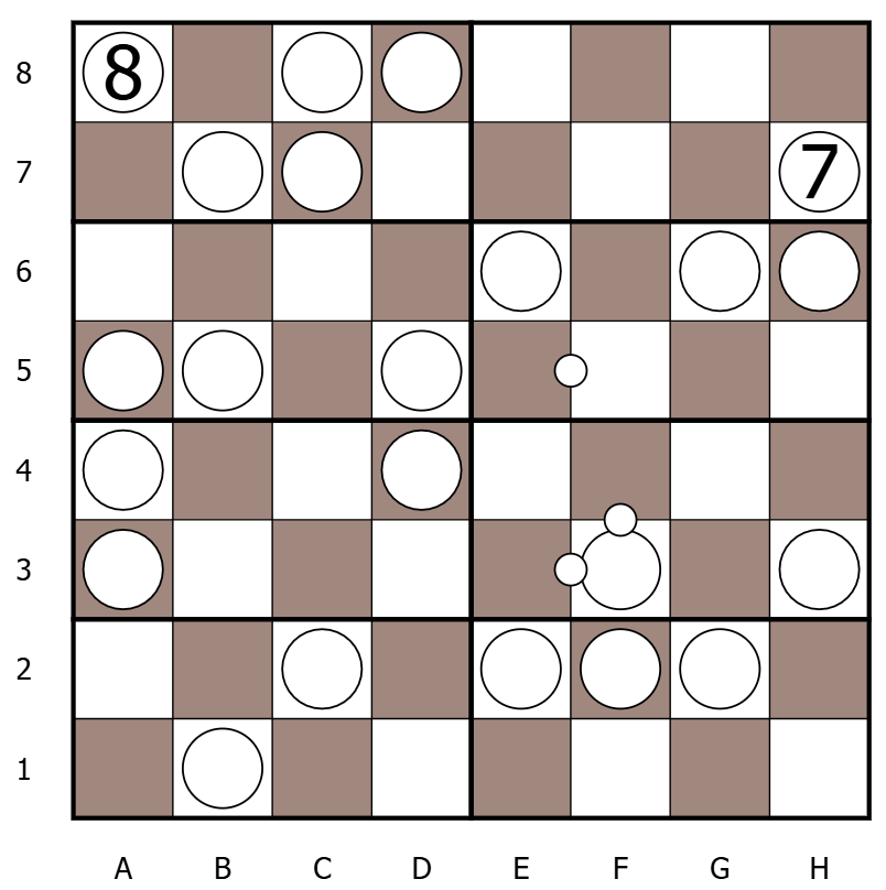 Es gelten die normalen 8×8-Sudoku-Regeln. Jede eingekreiste Zelle stellt eine Schachfigur auf dem entsprechenden Feld eines Schachbretts dar, wobei Weiß nach oben zieht. Jeder Figurentyp und jede Farbe ist einer eindeutigen Ziffer zugeordnet (zum Beispiel teilen sich alle weißen Bauern eine Ziffer und alle schwarzen Bauern eine andere), und nicht alle Figurentypen müssen vorkommen. Alle weißen Spielsteine haben eine niedrigere Zahl als alle schwarzen Spielsteine., und innerhalb jeder Farbe folgen die Ziffernwerte – sofern vorhanden – der üblichen Figurenhierarchie im Schach: Bauer < Springer < Läufer < Turm < Dame < König.