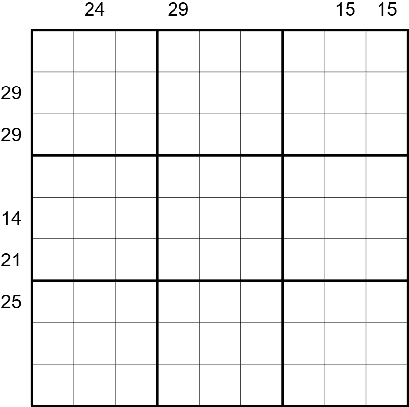 Clues outside the grid indicate the presence of a sandwich in the corresponding row or column. A sandwich has two digits that act as its boundaries. The clue is the sum of all the digits between those boundaries. The boundaries are the two individual digits of the clue, in any order; for example 31 outside the grid would mean that the sum of the digits placed between the digit 1 and the digit 3 (order is not given) is 31.