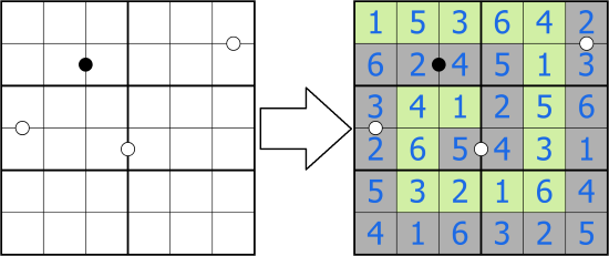 The image below shows a sample 6x6 puzzle and solution with the same rule set.