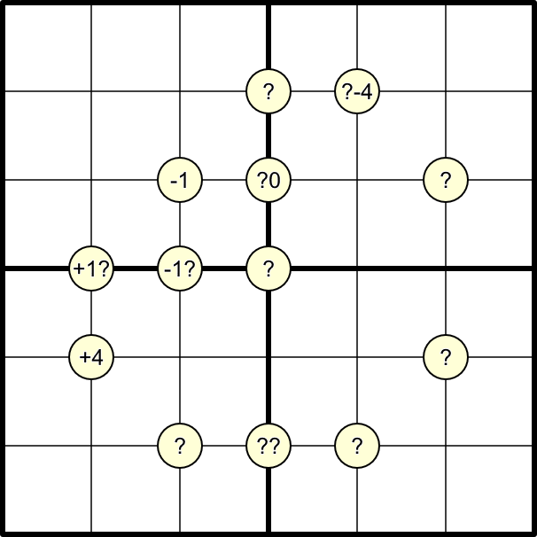 - A question mark may represent any number from -4 to 4, but whichever number it represents must obey all the above rules.