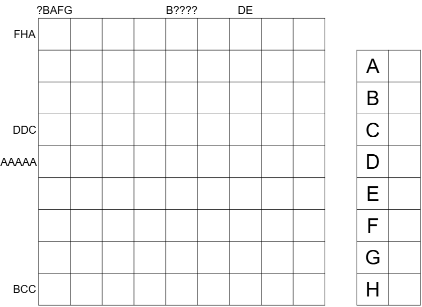 Schlüssel: Jeder Buchstabe steht für eine einzigartige Ziffer 0-9. Fragezeichen stehen für beliebige Ziffern 0-9. Führende Nullen sind nicht erlaubt.