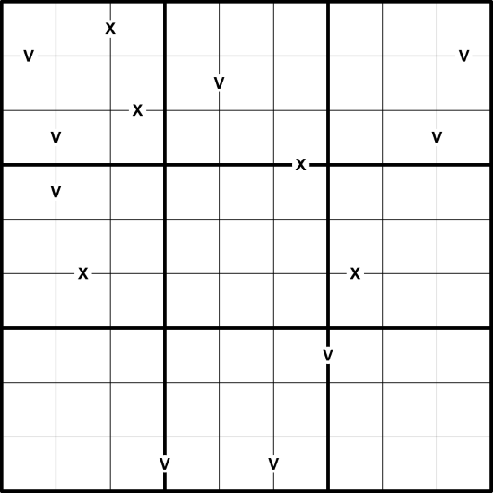 Digits in shaded cells count as the negative of their value for the purposes of the XV and difference constraints.