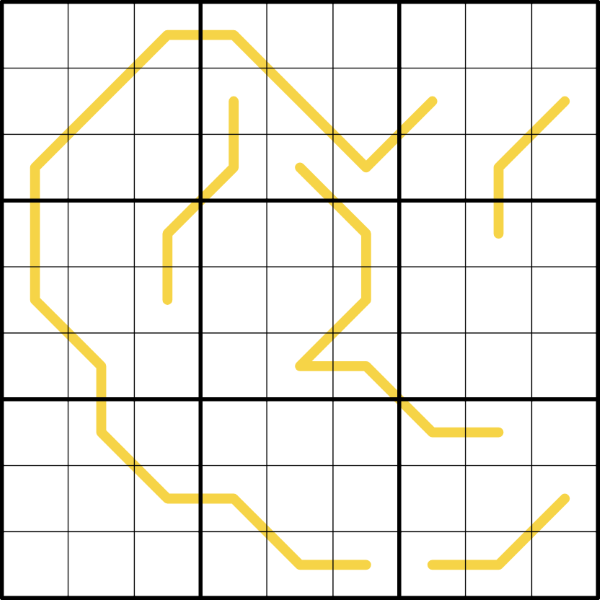 Fire- und Water-Zellen: Es gibt neun Fire-Zellen im Raster, genau eine in jeder Zeile, Spalte und markierten 3x3-Box, die mit einem vollständigen Satz der Ziffern 1-9 gefüllt sind. Es gibt auch neun Water-Zellen, die denselben Regeln wie die Fire-Zellen folgen. Es ist möglich, dass eine Zelle gleichzeitig zu beiden Sets gehört. Der Wert von Fire- und Water-Zellen ist die Zahl in der Zelle multipliziert mit der minimalen Anzahl orthogonaler Schritte zwischen der Fire-Zelle und der Water-Zelle innerhalb des jeweiligen markierten 3x3-Feldes. Wenn eine Zelle gleichzeitig eine Fire- und eine Water-Zelle ist, beträgt ihr Wert 0, da die minimale Anzahl orthogonaler Schritte 0 ist.