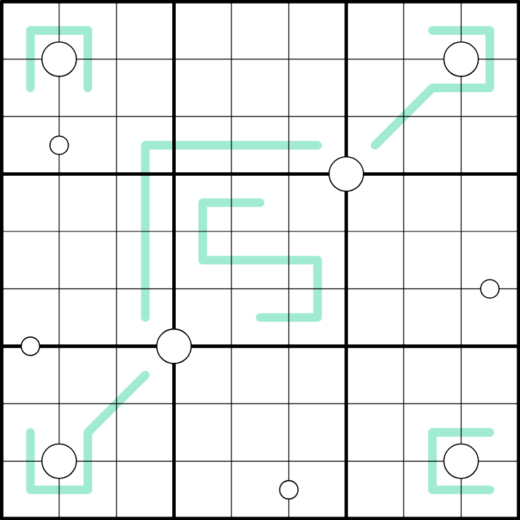 Every set of 3 adjacent digits on a teal line must contain a digit from each of the mod3 subsets of {1,4,7}, {2,5,8}, and {3,6,9}.