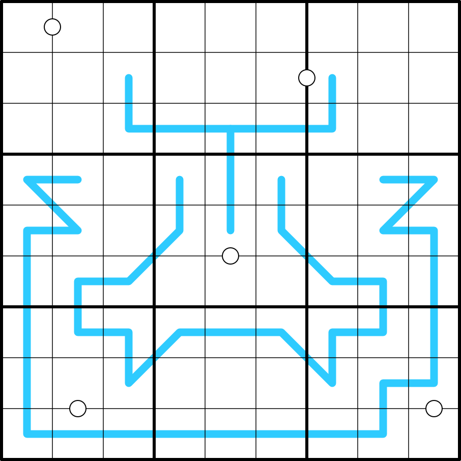 Region Sum Lines: Box borders divide blue lines into segments. The sum of the digits on each segment of a blue line is the same. Different lines may have different sums.