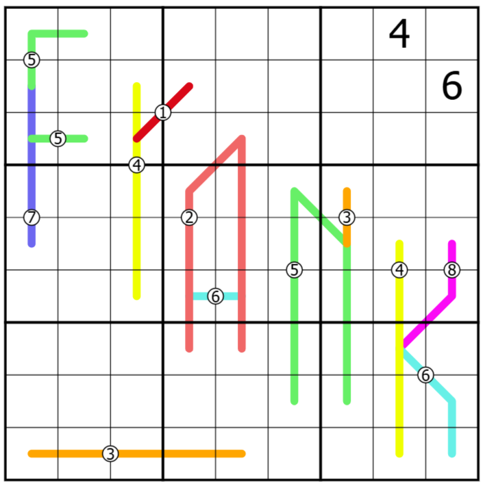 Whisper-X: On lines, adjacent digits must have a difference of at least X, where X is the value marked on the line. All lines of the same color have the same X value.