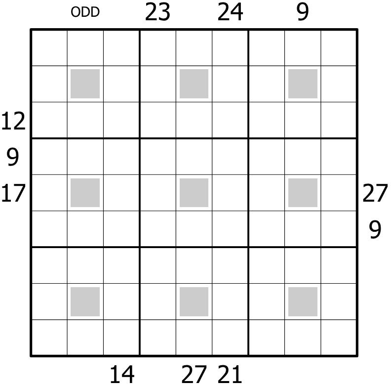 Ambiguous Little Killers: Clues outside the grid give the sum of the digits along one of the diagonals emanating from that cell, to be determined by the solver.