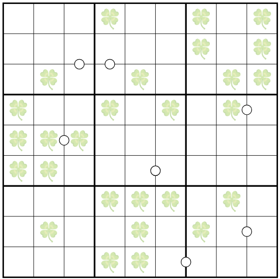 Ein Feld mit einem Kleeblatt enthält seine eigene Zeilen-, Spalten- oder Boxnummer (gezählt in der üblichen Schreibrichtung).