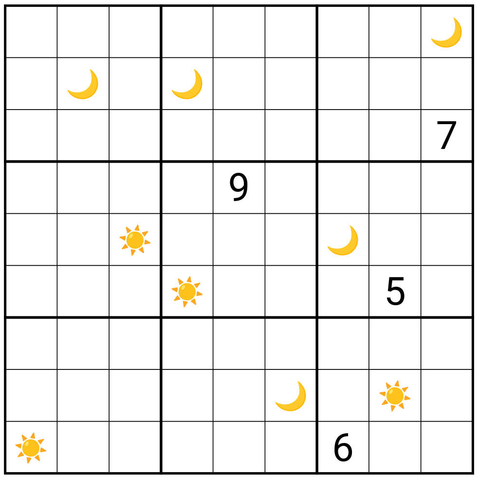 An even digit has a difference of at least 5 with any orthogonally adjacent sun or moon (regardless of whether they share a box).