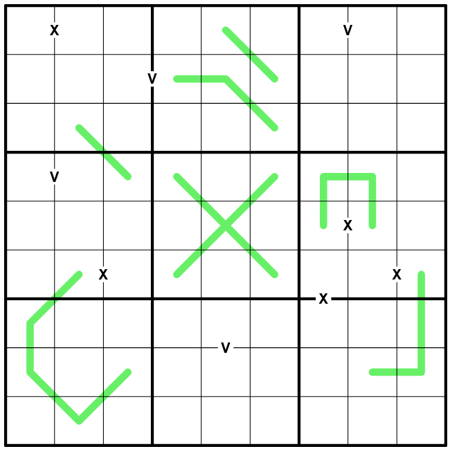 - Digits in cells separated by an X sum to 10. Digits in cells separated by a V sum to 5. Not all X's or V's are necessarily given.