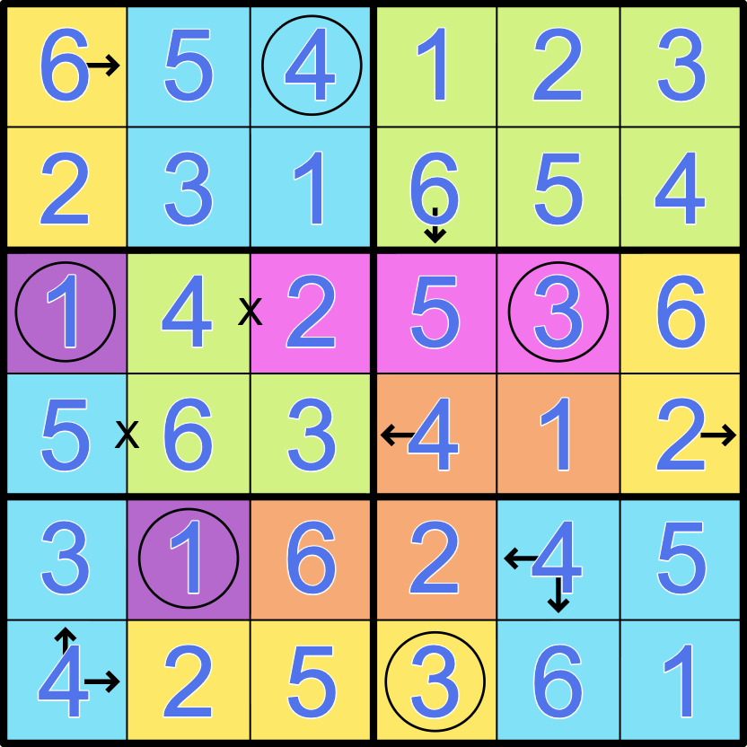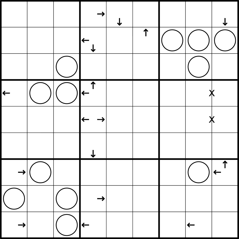 Arrows: A digit in an arrow cell equals the size of the largest group seen in any of the directions pointed to by the arrows. The arrow cell’s own group is always considered seen.