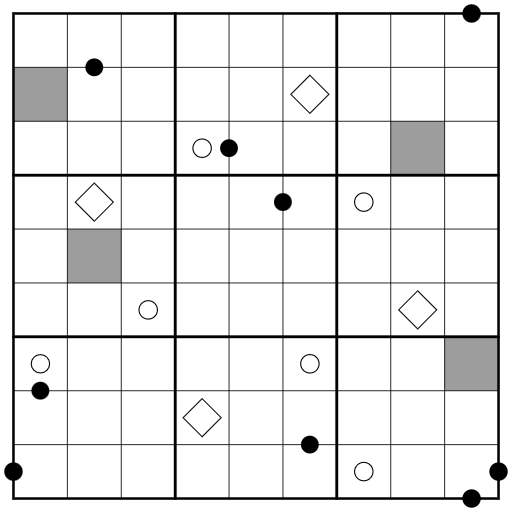 - Toroidal: The grid is toroidal, cells on opposite edges of the grid (e.g. r5c1 and r5c9) are considered orthogonally adjacent. This applies to all previous rules.